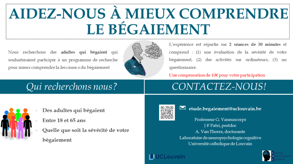 Nous recherchons des adultes qui bégaient qui souhaiteraient participer à un programme de recherche pour mieux comprendre la.les cause.s du bégaiement.
